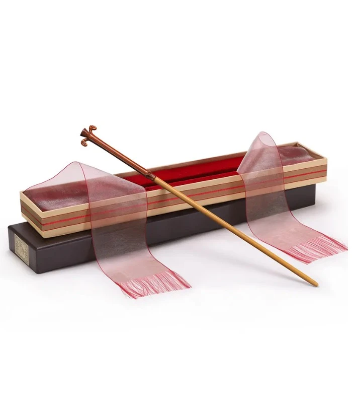 La baguette correspond parfaitement à sa personalité tape-à-l’oeil. Alors que les baguettes utilisées dans les deux premier films sont très simples, celle-ci possède un élégant pommeau en forme de lis. C’est un objet de collection pour les Potterheads.
