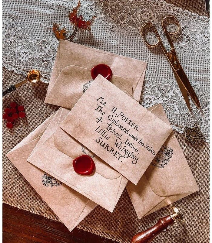 La box inclut un ensemble de papier à lettres sous licence Harry Potter ainsi que de la cire rouge, un sceau et le nécessaire pour accrocher les lettres au plafond.