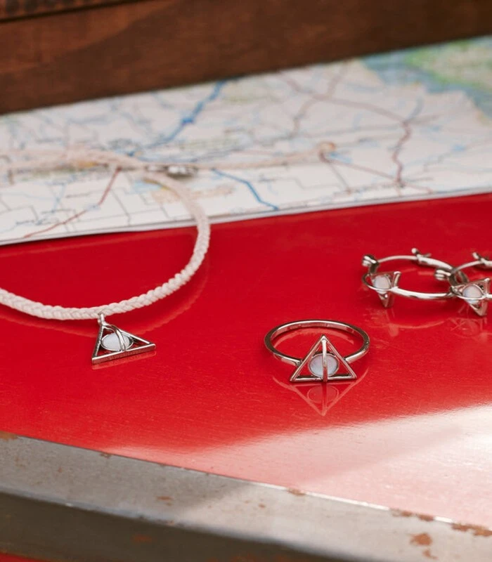 Sentez la puissance des reliques de la mort ! Suspendu à un bracelet tressée blanche, vous trouverez un charm Reliques de la Mort en argent, agrémenté d’une pierre de lune au centre pour une finition magique !