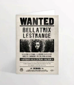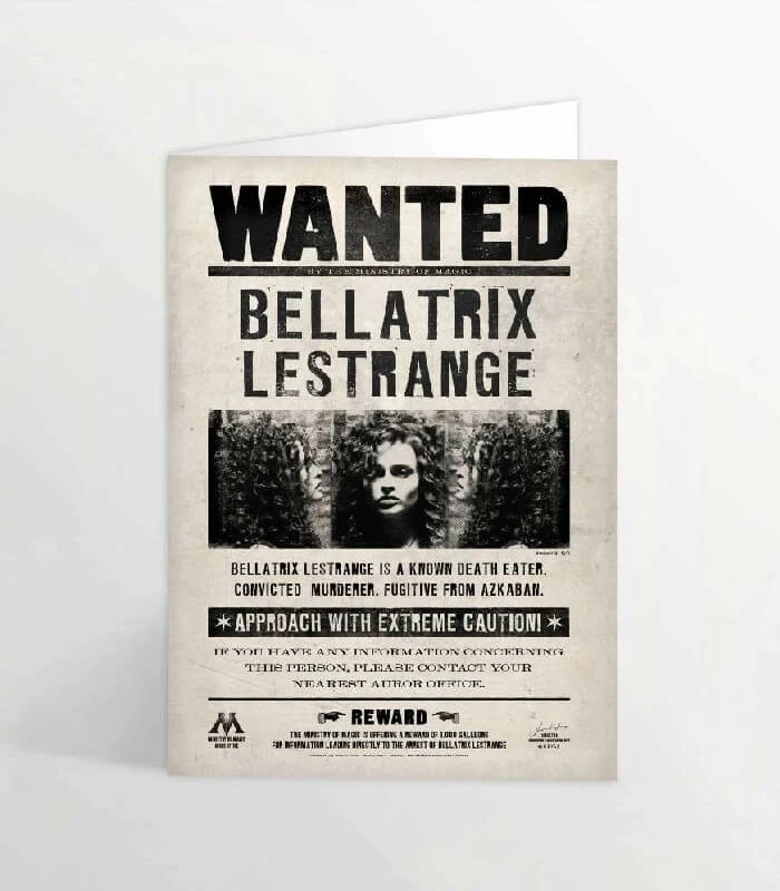 Bellatrix Lestrange fait partie des fidèles les plus proches de Lord Voldemort. Découvrez la carte de voeux représentant l’affiche de l’avis de recherche émise après son évasion de la prison d’Azkaban ! Cette carte à deux volets plaira aux amateurs des forces des ténèbres.