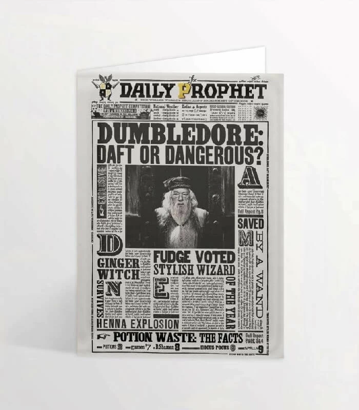 Faites plaisir à un fan d’Harry Potter avec cette belle carte de voeux à deux volets représentant Albus Dumbledore en une du Daily Prophet : « Dumbledore : idiot ou dangereux ?