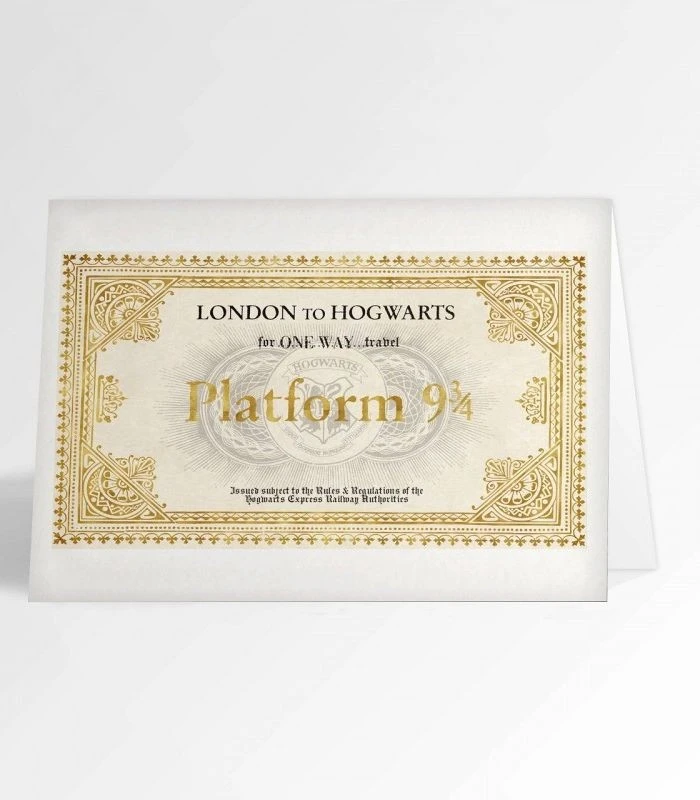 Découvrez cette carte de voeux pour faire un clin d’oeil aux passionnés d’Harry Potter ! Cette carte en deux volets représente le Ticket qui vous mènera de Londre à Poudlard à bord de ce train magique, l’Hogwarts Express, que vous prendrez sur le quai 9 3/4.