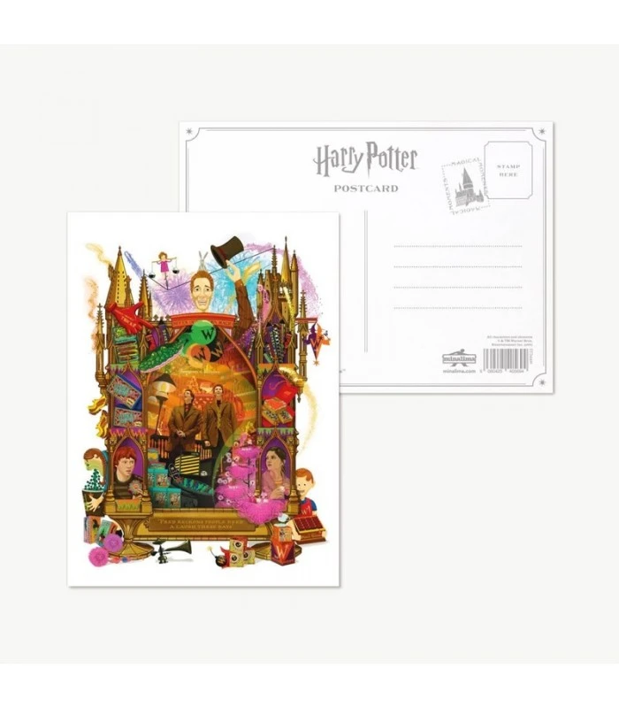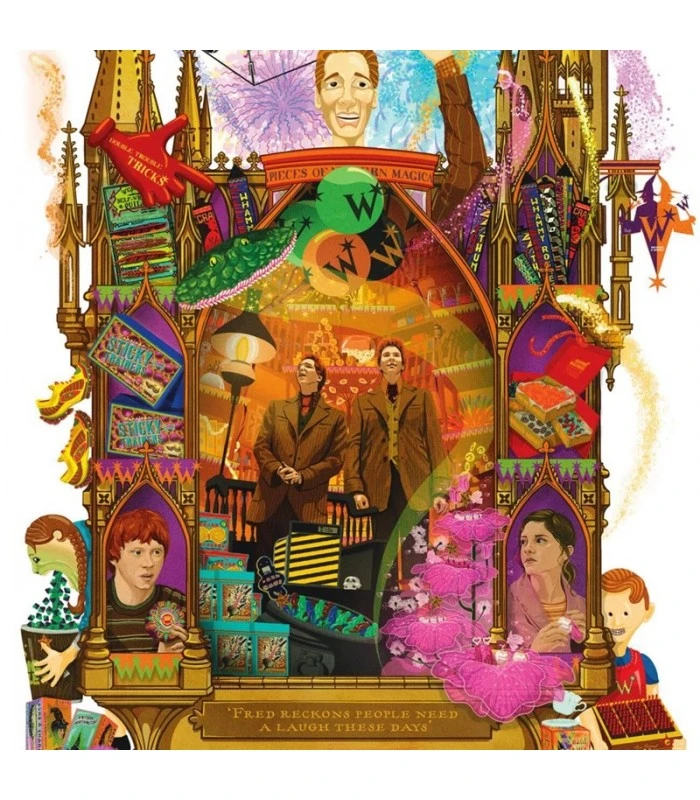 Cette illustration des designers Minalima est inspirée du livre Harry Potter et Le Prince de Sang Mêlé. C’est une belle illustration de la Délicieuse Boutique de Fred et Georges Weasley.