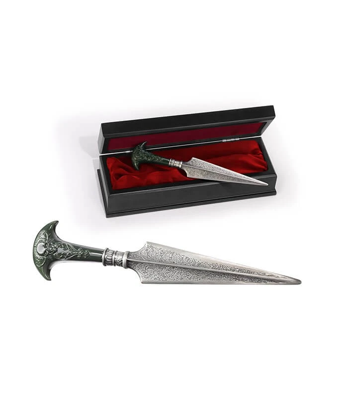 Voici la réplique officielle de la dague de Bellatrix Lestrange, on voit apparaitre ce poignard dans la première partie d’Harry Potter et les Reliques de la Mort. Bellatrix est certainement l’une des mangemorts les plus fidèles à Voldemort et se distingue des autres notamment par l’assasinat de personnages proches de Harry. Cet objet de collection est livré dans un coffret collector doublé d’un magnifique velour rouge pour le présenter et le protéger.