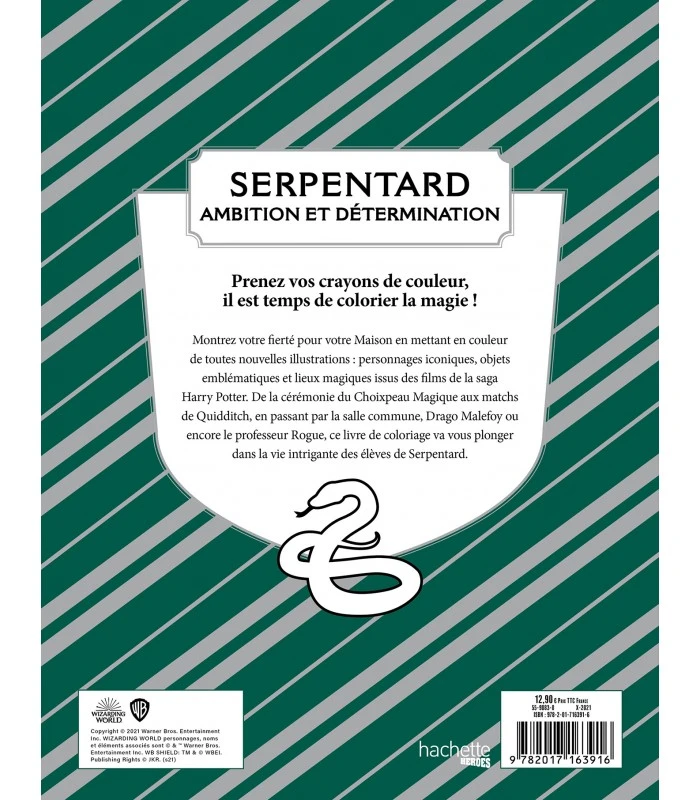 De la salle commune au château à la Chambre secrète, en passant par les élèves, le serpent ou encore le fantôme du Baron Sanglant, retrouvez 45 illustrations dans ce nouveau livre de coloriages dédié à la Maison Serpentard.