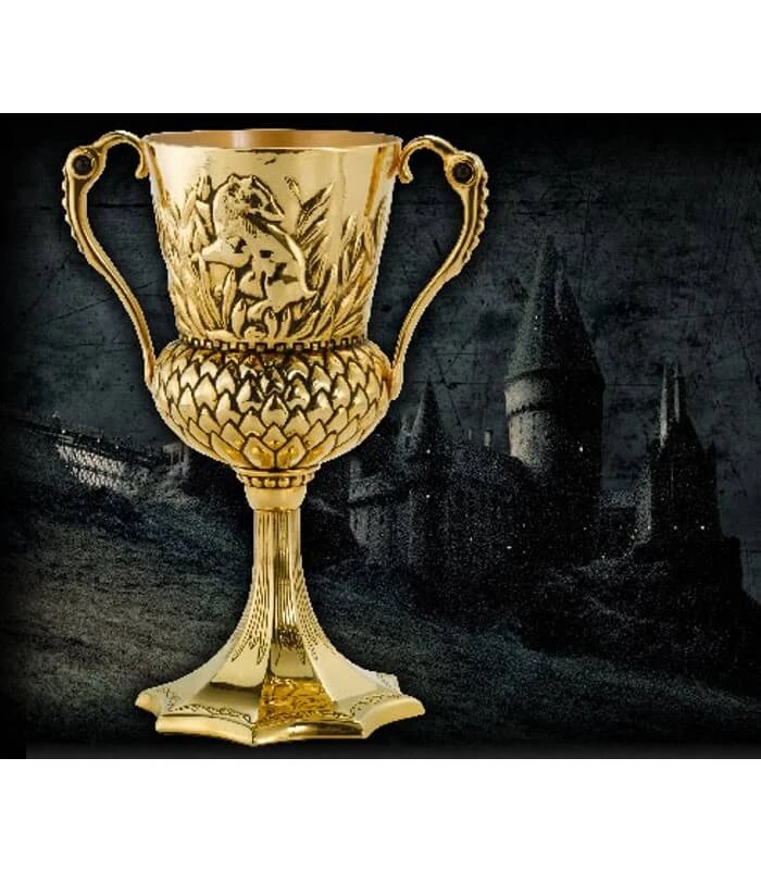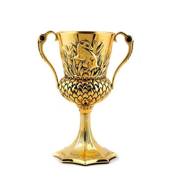 Que vous soyez Poufsouffle ou adeptes de la magie noire que renferme les Horcruxes, redécouvrez ici la Coupe de Poufsouffle ! Appartenant initialement à Helga Poufsouffle, un des quatre fondateurs de Poudlard et qui créa la maison Poufsouffle, cette coupe fut ensuite transmise à une de ses descendantes. Par la suite, Tom Jedusor (Lord Voldemort) s’en empara pour y enfermer un bout de son âme la transformant ainsi en Horcruxe…Harry Potter et ses amis réussirent à la récupérer des années après (non sans libérer un dragon au passage) et à détruire l’Horcruxe ! Retrouvez cette coupe finement sculptée sur laquelle figure l’emblème de Poufsouffle, le Blaireau, un animal aux abords calmes mais qui sait se défendre, gravé sur une coupe aux couleurs dorées rappelant les couleurs de la maison ! Un objet hautement symbolique qui saura compléter votre collection d’Horcruxes ou décorer votre foyer aux couleurs de Poufsouffle !