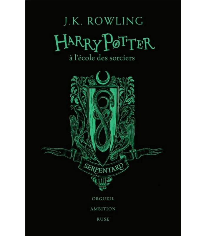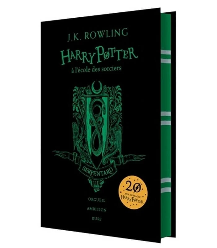 Si le Choixpeau vous place à Serpentard de par votre ambition et ruse, alors vous vous devez de retourner à Poudlard par la porte de la salle commune Serpentard ! Découvrez cette réédition d’Harry Potter à l’Ecole des Sorciers, parée de vert, afin de fêter les 20 ans des aventures du jeunes sorciers ! Profitez de nombreuses surprises telles que des bonus illustrés, quiz sur Poudlard, et bien d’autres ! Cette édition spécialement dédiée aux Serpentard présente une couverture illustrée de du fameux emblème de la maison : le Serpent. Au dos, un personnage des plus lugubres vous attend : le Baron Sanglant ! Un retour à Poudlard en grandes pompes assuré !
