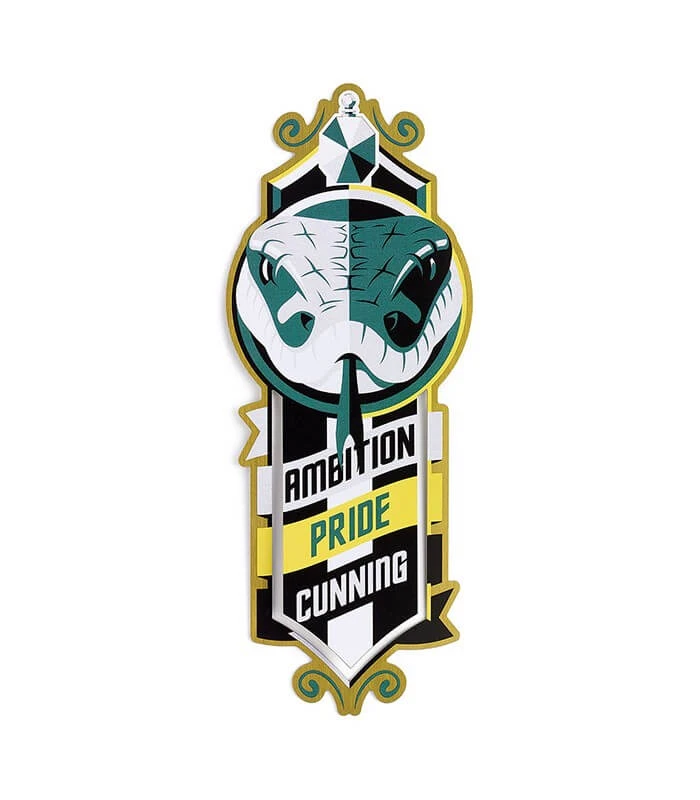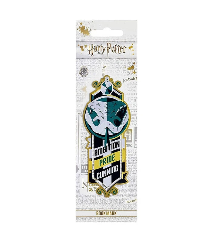 Fans de la maison Serpentard et amateur de lecture ? Ce marque-page est fait pour vous ! Dévorez les livres sans perdre la page avec ce marque-page Serpentard en métal. Une tête de serpent orne le haut du marque-page et on y retrouve également les trois valeurs de la maison : ambition, fierté et ruse.