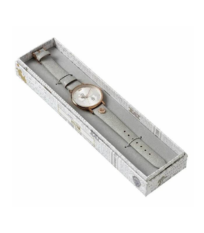 Soyez toujours à l’heure avec la montre de la maison Serpentard ! Son cadran doré et son bracelet argenté sont ornés du blason de la maison au serpent, la maison de Draco Malfoy.