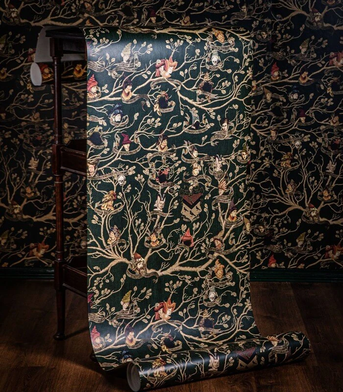Vous souhaitiez avoir une pièce dédiée au monde de Harry Potter ? C’est maintenant possible grâce au papier peint créer par Minalima. Le papier peint est intissé avec pour motif la tapisserie des Black. Sorciers et sorcières bricoleurs prenez garde le motif se raccorde, il est donc conseiller de faire attention à la position des motifs lors de la pose du papier.