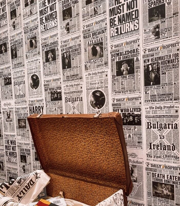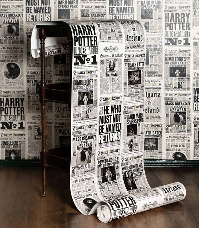 Vous souhaitiez avoir une pièce dédiée au monde de Harry Potter ? C’est maintenant possible grâce au papier peint créer par Minalima. Le papier peint est intissé avec pour motif le daily prophet. Sorciers et sorcières bricoleurs prenez garde le motif se raccorde, il est donc conseiller de faire attention à la position des motifs lors de la pose du papier.