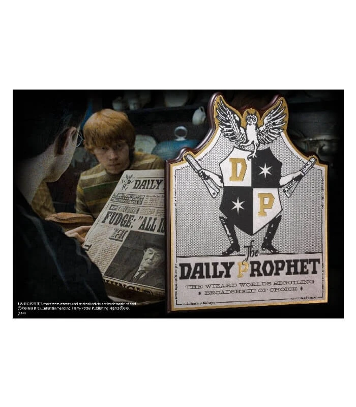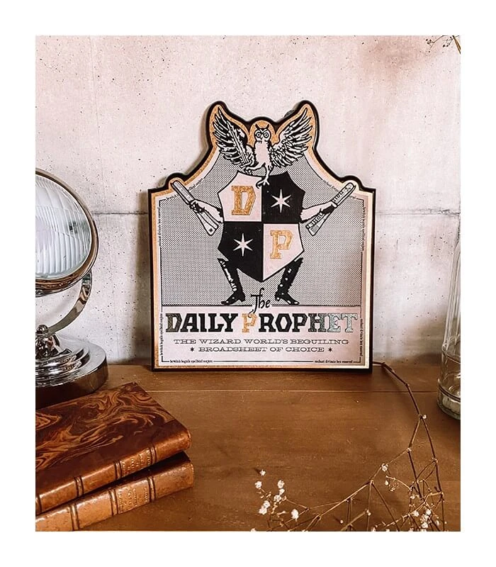Découvrez l’enseigne du Daily Prophet (Gazette du Sorcier) ! La Gazette du Sorcier est le journal britannique matinal des sorciers, étant bien naturellement lui aussi magique, les photos de chaque article sont animées ! Livré tous les matins notamment par Hiboux, il est un véritable acteur de la vie des sorciers : le journal annonça le retour officiel de Lord Voldemort au moment où beaucoup en doutaient, les évasions de Mangemorts d’Azkaban, l’arrivée de Severus Rogue au poste de Directeur de Poudlard, et dans ces heures les plus sombres, il diffusa l’avis de recherche pour Harry Potter. Retrouvez sur cette plaque une chouette portant le blason du journal, et donnez à votre maison un air de maison d’édition magique ! N’oubliez pas cependant que si vous ne payez pas votre journal, les hiboux vont se fâcher !