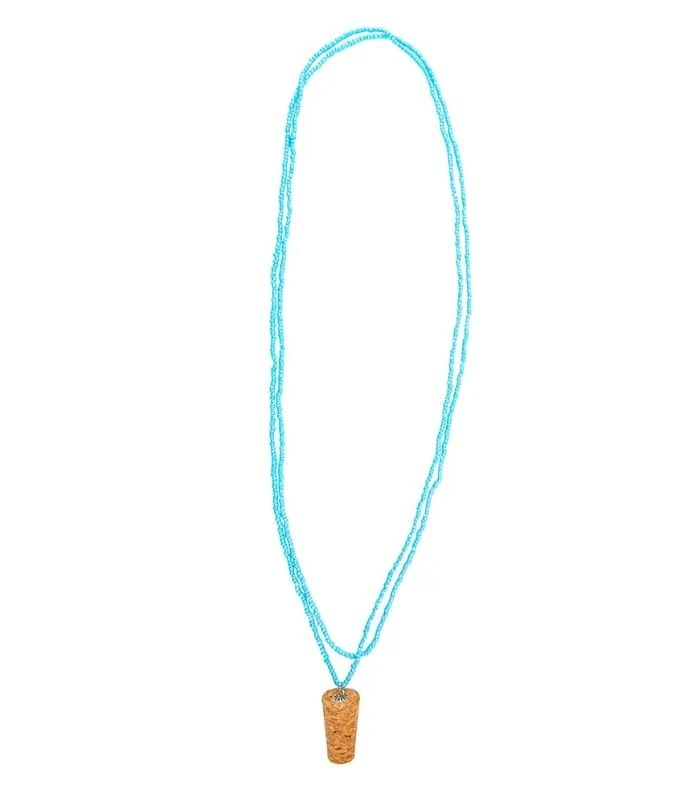 - Collier : Perles de verre Bleu ciel avec un bouchon de liège en pendentif 160 cm.